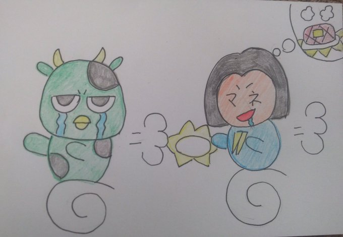 今年のカッパぐりーんちゃんへの年賀状 牛になったぐりーんちゃんをマネさんがステーキにしようとしている😁 ぐりーんちゃんの頭の皿をステーキの皿に😁 #カッパぐりーん