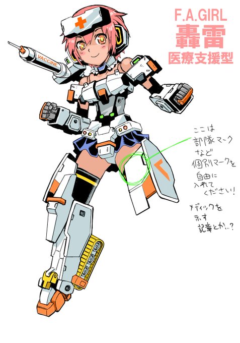 先日の医療支援用FAガール轟雷、 ニンジャスレイヤー=キングさん(@KINGGOGOTW)が模型を作ってくださっているので、下半身を描き足しました! ワクチンの普及や感染拡大を正しく防止する趣旨に沿っていただけるなら、カラーリングのご利用はどなたでもどうぞ! #医療関係の皆様ありがとうございます