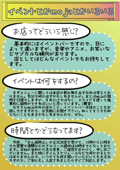 来週、1月25日にエデン本店(@Eventbar_Eden)にて出張バーmoja(@bar_moja2)を行わさせていただきます! 感染状況により時間変更はありますが、日程に変更はありません。資料とか作る予定です。(現時点進捗0) 無駄に何年も界隈のイベントバーにいてしまったので、色々聞いてもらえるとありがたいです!