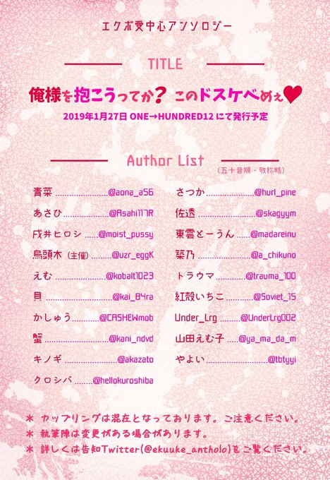 素敵作家様たちのあらゆるエク受が読めるという夢のような本ですのでエク受け好きの皆様に届くようRTして下さると嬉しいです!!!