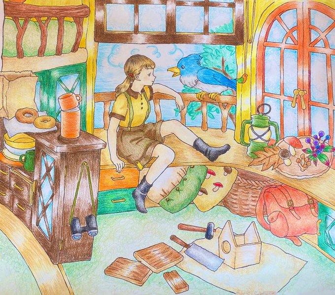 (線画は市販の塗り絵、『わたしの塗り絵BOOK憧れのお部屋』から抜粋)