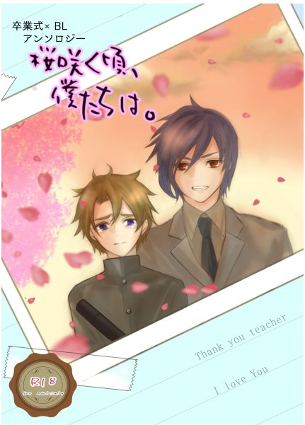 #J庭 の新刊、卒業式×BLアンソロジー「桜咲く頃、僕たちは。」。五名が手掛けた小説アンソロジーです。頒布価格は600円ですーよろしくお願いいたします。 #J庭50