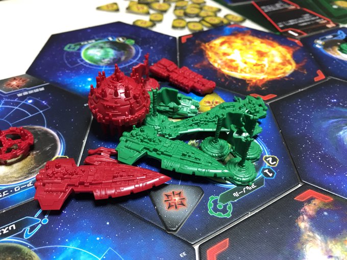 【トワイライト インペリウム】 1Rでも盤面が賑やか✨ 交渉も勝利に必要な宇宙ゲーム 要素がありったけあり、全部終わっても3.4割位の理解だったので次やるときはルールを一覧にして臨みたいデス! 重ゲ会20190330