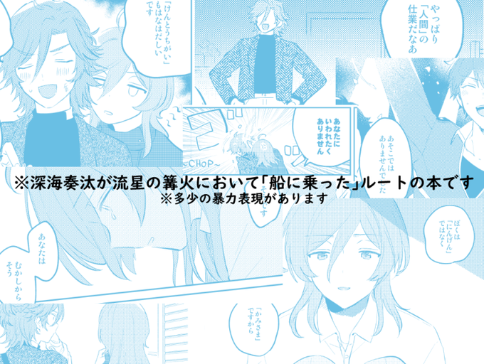 これは5月30日まだ旅合わせの新刊のツイート 奏汰くんが篝火で船に乗ったルートのほん(全年齢) 多めのサンプルはpixiv https://t.co/kB1V4YR8jq これは通販 https://t.co/XS3tZPJLVI