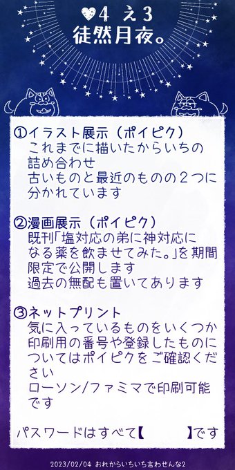 改めて本日のお品書きです! パスワードは会場のお品書きの方をご確認ください 目新しいものはあまりありませんが、どうぞよろしくお願いします🙌💙💜 #おれからいちいち言わせんな2 #おれいち2