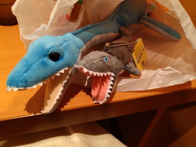 恐竜博2019の物販でモササウルスを、国立科学博物館ミュージアムショップでフタバスズキリュウを買ってしまったので、くまみねさんの「これからしかられるネコ」みたいな感じで家に帰ってます。
