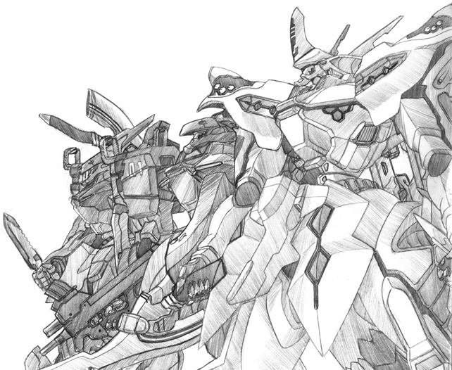 実は、線画の段階ではマブラヴアンリミテッドが世に出て間もない頃で、武御雷と吹雪のみでしたが、色を塗る頃には機体や設定も増えたので、ハイヴ攻略戦を意識して不知火に書き換えました。