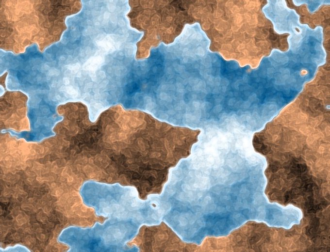 <ツクールMV製ローグライク制作> ワールドマップ的な画面を作っています。 手始めに、背景画像を作成。 画像編集ソフトの雲模様フィルタで地形のベースを作り、あれこれフィルタを多用して、それらしい見た目にしました。