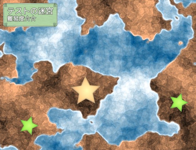 <ツクールMV製ローグライク制作> ワールドマップ風な見た目の、ダンジョン選択画面ができました。 選択中のダンジョンは、星形のピクチャの色が変わって回転します。 方向キーでもクリックでも操作可能。