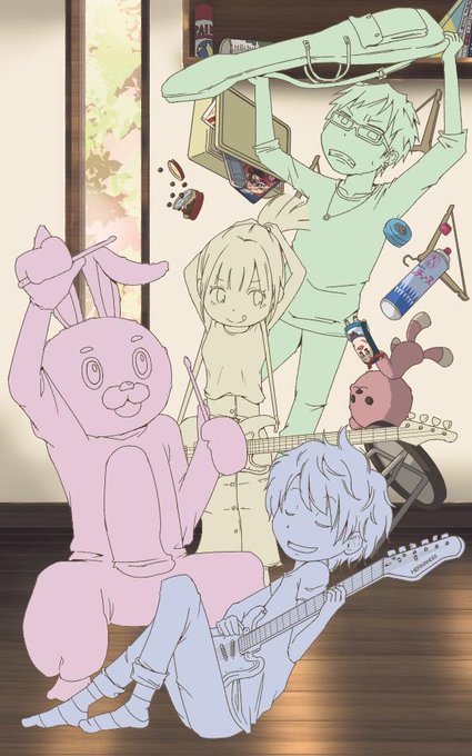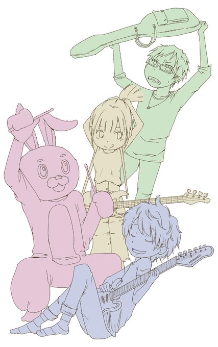 長かった〜!!「ウチの離れが練習に使えるよ!」とか、学生バンドなら誰しも憧れますよねぇ♪そんなことを考えながら描きました。ちなみに女の子とウサギ男は、描いてて兄妹な気がしてきた