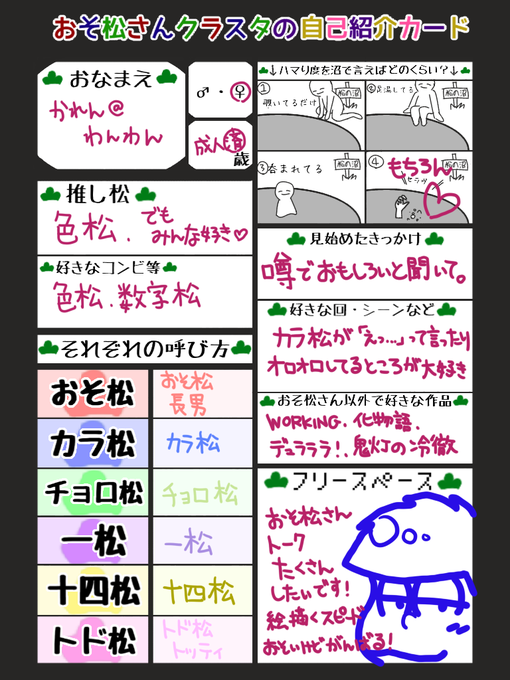 (ヮ゚ω゚)ン<おそ松さん語りたいです!ゆっくりペースだけどお絵描きしてます・・お気軽に絡んでくださいね!一言いただければ基本フォロバします!相互希望です! #おそ松さんクラスタと繋がりたい #絵描きさんと繋がりたい