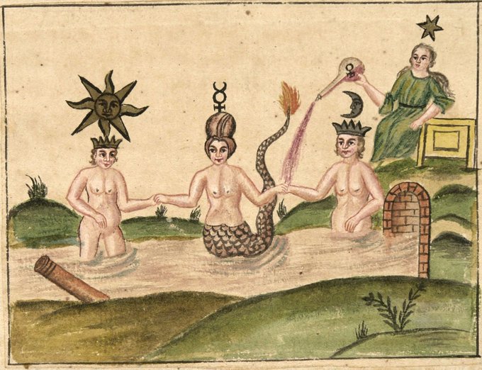 Mermaids, mermen & alchemical mysteries from the "Clavis Artis" held in Trieste's Biblioteca Civica Attilio Hortis & published in Germany in the late 17thc. The manuscript's title page claims it's a translation of Zoroaster written on dragon skin in the 13thc #FairytaleTuesday