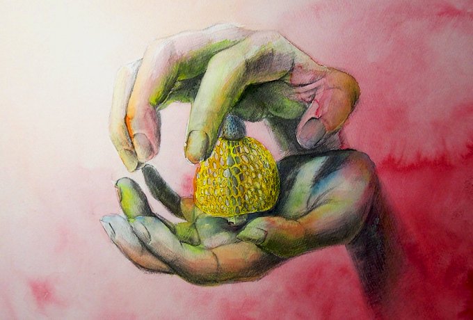 デジタルイラストや漫画を描いたり(1枚目)、デッサンをPCに取り込んで写真と合成編集したり(2枚目)、水彩で手にキノコを生やしたり(3、4枚目)
