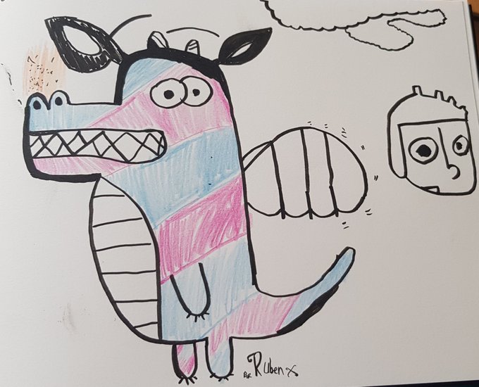 A lunchtime #DrawWithRob today creating three Dragons (or are they dinosaurs 🤔 ?!). Two are fighting bravely against knights but the third seems much more peace-loving.