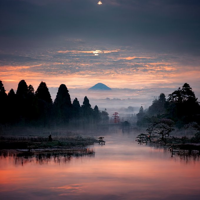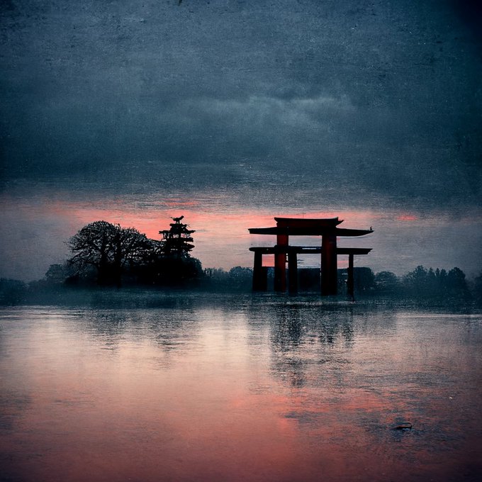 夕闇、カラス、鳥居、褪せた夢、夕凪。 #midjourney