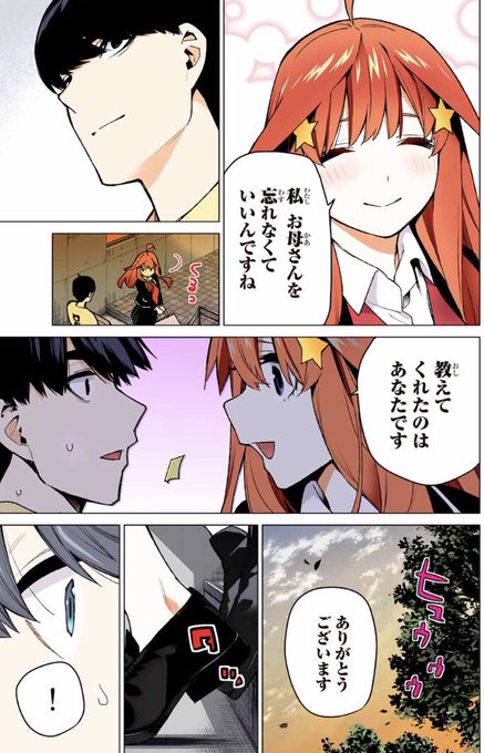 誓いのキスの時に5年前の話するじゃん。その約半年後の学祭で五月以外の4人キスするじゃん。でも五月はキスしなかったから5年前の話ができるのは五月だけじゃん。 だから俺は2人の顔が接近した時に風太郎が五月の唇を見て鐘キス犯が五月だとわかったと同時に五月の大勝利を確信していました…