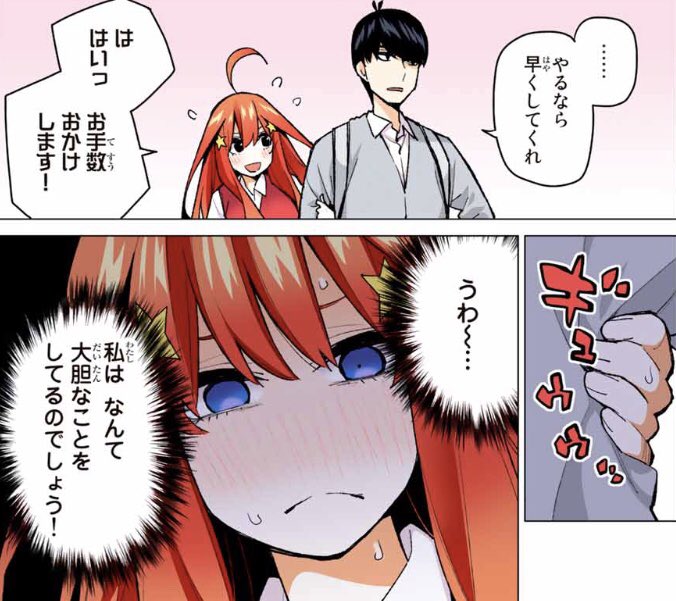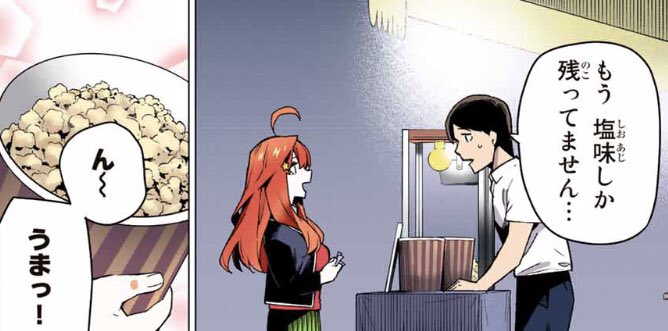 ここは来週やるのかな?それともカットされるのかな。すっかり自信をなくした三玖を二乃なりに励ますシーンだからカットしてほしくないな