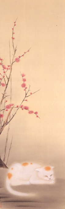 あたたかい日が増え、梅の花が見頃ですね。現在当館の常設展示室にも、紅梅が咲いています。小茂田青樹の《麗日》は、梅の花を輪郭からはみ出る程のぼかし塗りで表現。まるで梅の香がにじみ出るようです。うずくまる猫もぼかしと細やかな毛描きにより、発光しているようにも見える作品です。
