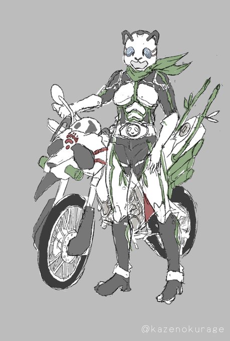 @panna_tokusatsu ツイートありがとうございます! せっかくなので 勝手なこだわりと妄想を補足します ・コンセプトは『昭和愛もある現代(平成・令和ぽい)ライダー』なのでファーストとかアマゾンズっぽい ・バイクモデルは『ホンダXR250』 (555、剣、電王とかのやつ) ・身体の線とマフラーが笹になってます