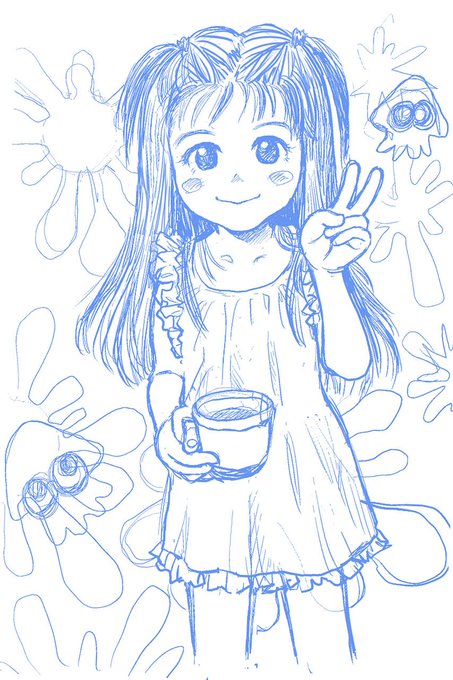 一年程前に 知り合ったママ友さん。その娘さんは小学校1年生になったばかりの可愛らしい女の子。その娘さんの似顔絵を描かせてもらいました。スプラトゥーンがお好きなお母さんと女の子なので、背景をそれ風に。