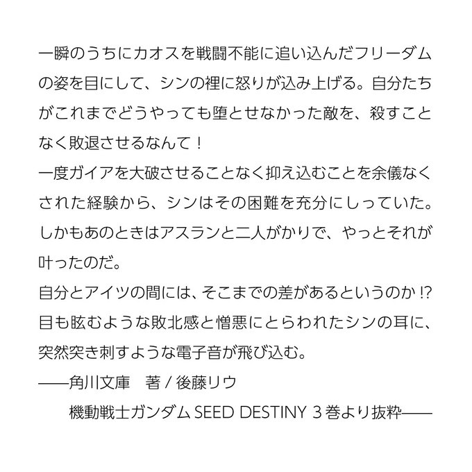 シン、フリーダムと初めて対峙してインパルスの腕を落とされた時は舐めたマネをぐらいに思ってる。