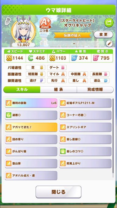 芝短S、登山家獲得、差しスキルは非常に良い揃いだったのに乗り換え上手とプロフェッサーイベ無し終わり、道中太り気味と寝不足重なって結果がつらひ…
