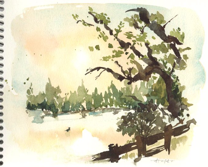 きょうの水彩: 井の頭池の夕日