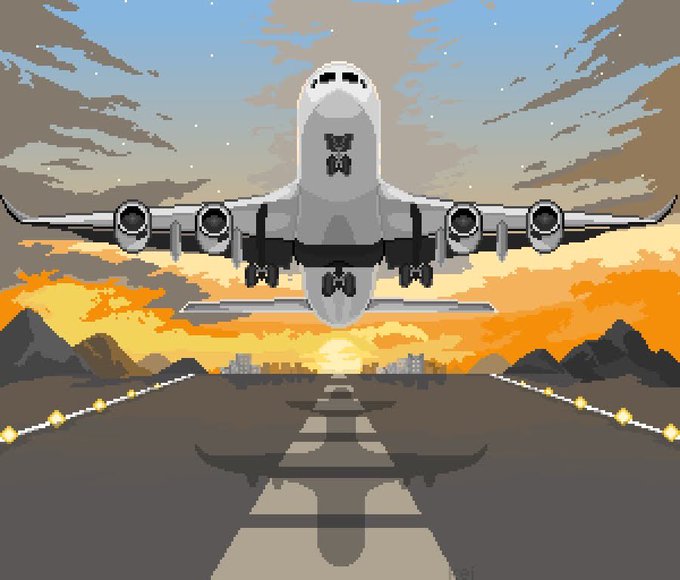 飛行機が飛び立つ瞬間の絵になります。 時間かかりましたが空いた時間に少しずつ描いて完成しました! いい感じに仕上がったので是非見てください! #ドット絵 #pixelart