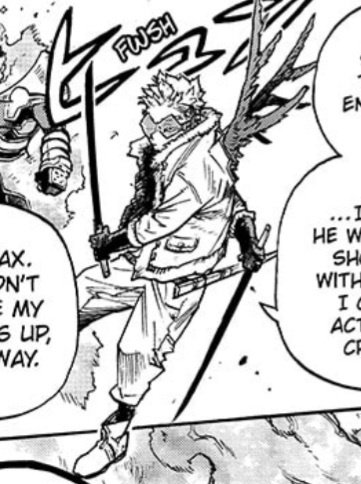 hawks using katanas to the war is so fucking cool, love that hori is telling us that the worries about his wings were unnecessary he just grabbed katanas and some of his larger feathers have grown back already and that has an even cooler impact
