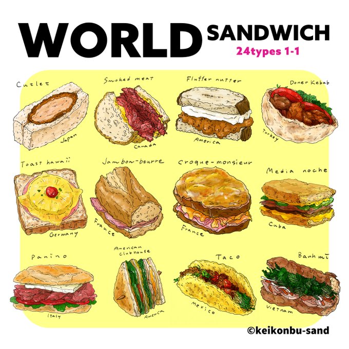「ワールドサンドイッチ24」 再編集してようやくLINEスタンプリリースできた〜!https://t.co/aUZKiAfd5x 世界のサンドイッチ🥪描きました😳 #サンドイッチ #世界のサンドイッチ #グルメ #パンレシピ #イラスト #食べ物イラスト #LINEスタンプ #illustration #illustrator #sandwich