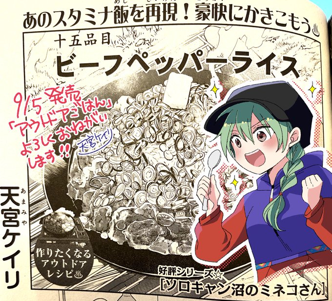 【お知らせ】本日発売の少年画報社刊、「アウトドアごはん」に #ソロキャン沼のミネコさん 「ビーフペッパーライス」描いてます。ペッパーランチのアレです。凄く簡単なので、作りたくなっても安心♨️