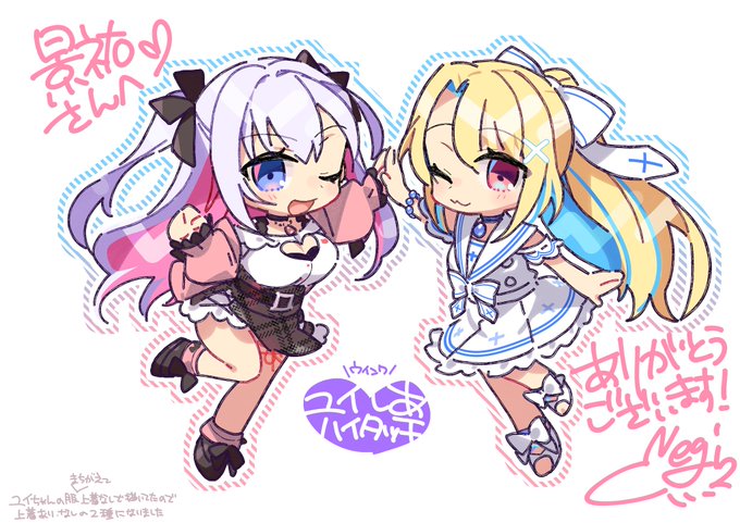 skebでNEGI(@ulogbe)さんに結目ユイさんと水瀬しあさん描いていただきました!!! 3等身にデフォルメされたお二人をかわいらしく仕上げてくださってありがとうございます! #結目ユイ #水瀬しあ