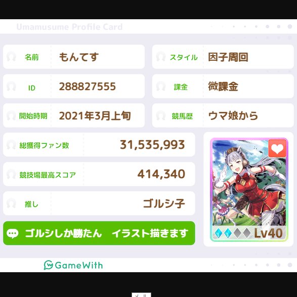 #GameWith #ウマ娘自己紹介カード ゴルシしか勝たん ウマ娘から競馬始めて ソダシ賭け勝ち!ユーバーレーベン賭け勝ち! 幸運ガールゴルシちゃん推し ナリブも好き 追込差しウマ娘好き イラストもたまーに描きます