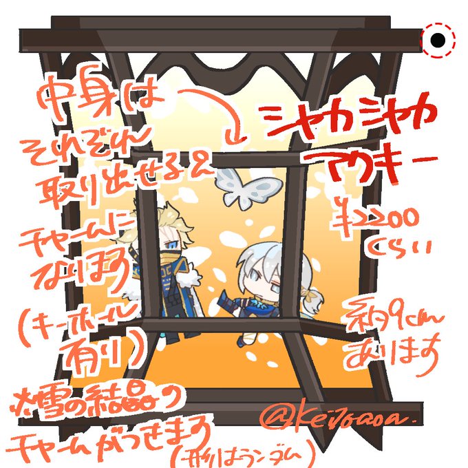 とりいそぎ最終稿と説明を…… また改めてお知らせします 現物はまだ届いていないので、発送自体は月末近くになるかもです 値段はまだ迷っている…下げたい… シャカシャカアクキーの方はたぶん、雪の結晶チャーム(ステンレス)と鍵チャーム(合金)が付くかもです どっちかになるかも
