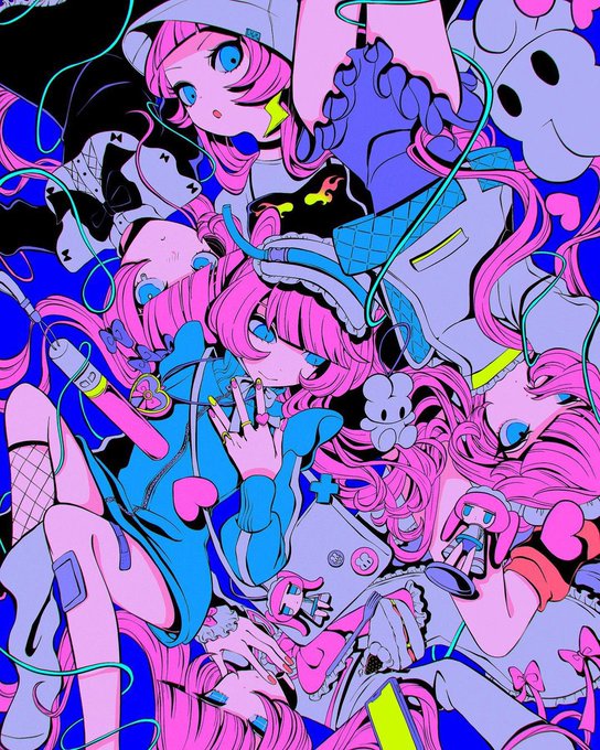 ネオンカラーに染まる #1:09 さんの幻想的なグラフィック。カワイイを象徴する要素が溶け合うように描かれた鮮烈なヴィジュアルが独創的。異なる世界線を眺めているようでありながら、ふいに見せる影や情感にシンパシーを感じるかもしれない。