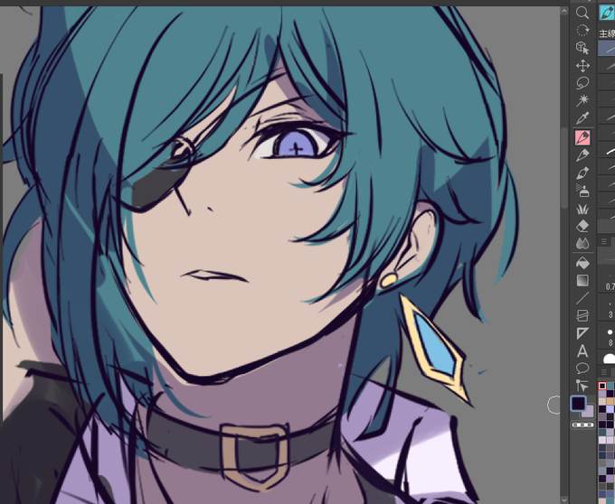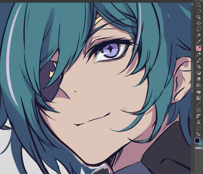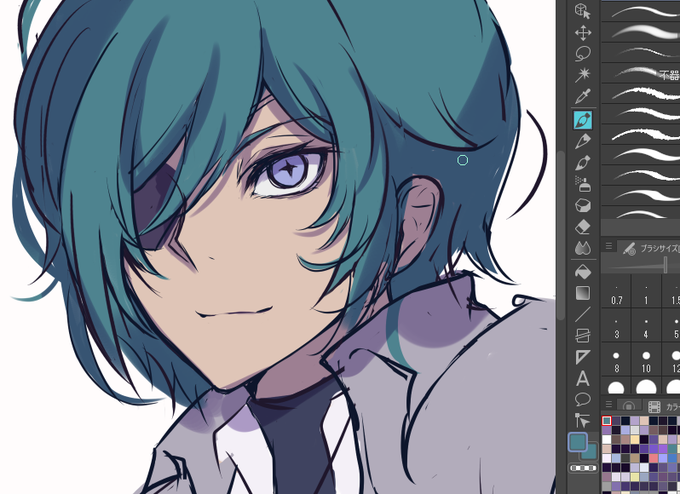 デッサンがしっくりきはじめたらっ 顔パーツの微調節とか光あててみたり線整理してみたり とにかくキャラのかっこよさを信じてまだだっまだいけるってきもちでいつも頑張るっだいたいかっこよくなってくるっ もうそろそろカラーラフの終わりっ
