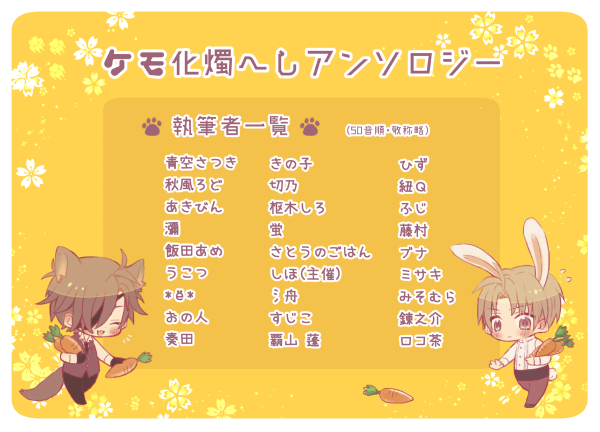 こちらは、2017年5月蜜藤4にて発行予定の、『ケモ化燭へしアンソロジー』の告知アカウントです。