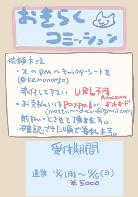 【コミッション】 fanboxにて先行募集していたお気楽コミッションを全体で募集します! (注意事項) ※リテイク無し ※前払い ※先行とは少し支払い方法や金額が変更しています 2〜4枚目はサンプルです
