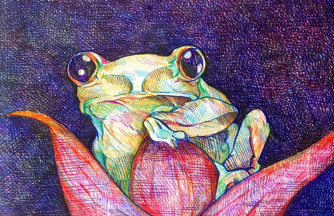 カエルさん描きました! 目がくりくりで可愛いです🐸 #ボールペン画 #絆けんしん流 #絵描きさんと繋がりたい