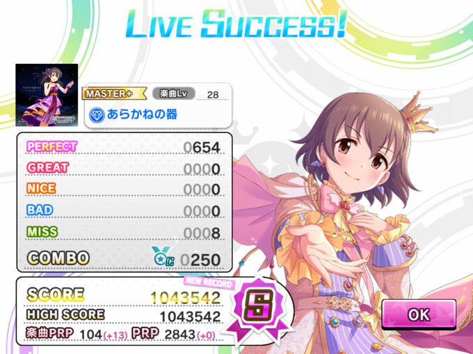 あらかねの器MAS+ フリックでフルコン遠い… スライドが多いせいか通常編成よりアクト入れるとコンボCでもPa姫センターでスコアSいく。 神曲で手応えあって没頭できる。 #デレステ