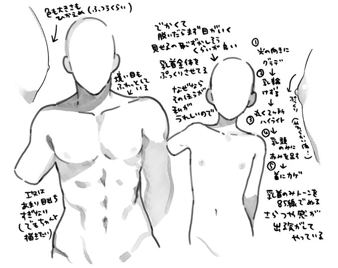 私のカプ顕著すぎて何も参考にならないかもだけど一応こんな事考えて描いてるよってメモです…。私は攻の乳首基本触らないのであんまり性器っぽくならないように、受は好きなエロ作家さんや自撮り上げてくれてる女装男子の方とか参考にしてます。攻も受もあなた好みの乳首をスクラップするのおすすめ!