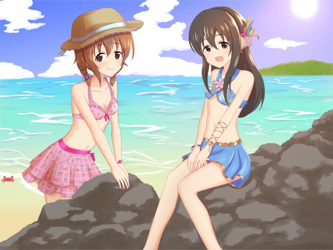 #モバマス版深夜の真剣お絵かき60分1本勝負 #デレステ6周年 #森久保乃々 #早坂美玲 完成ver。6周年まであと5日(1日)! イカダ浮き輪に乗るののちゃんと美玲ちゃんです!!