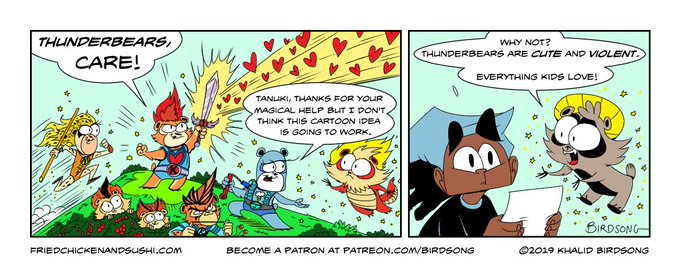 THUNDERBEARS! Tanuki makes a magical cosplay combination in today's FC&S comic! #thundercats #carebears #80s #cartoons #cosplay #comics #tanuki #japan #webcomic #khalidbirdsong #friedchickenandsushi