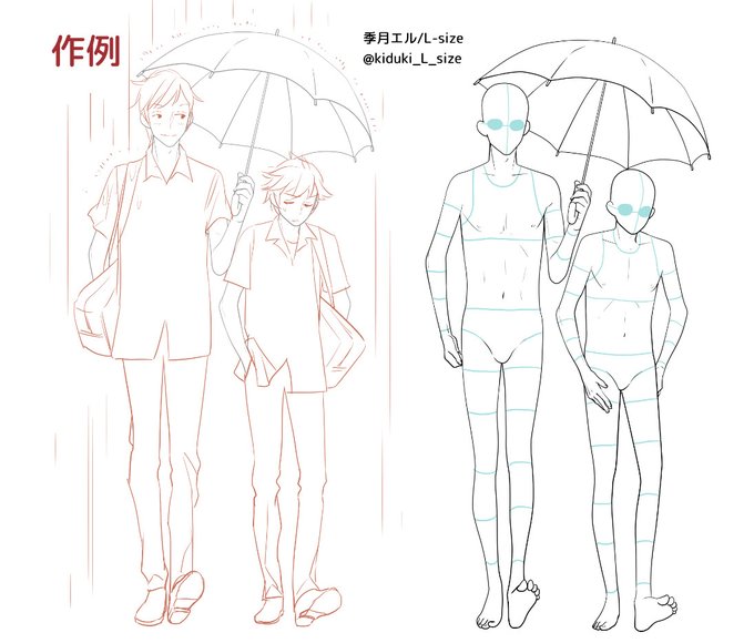 お題箱「相合い傘の体格差男子、大きい方が傘持ち照れ気味、小さい方が渋々といった素体」