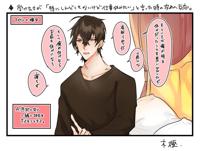 ◆受けが「特にしんどくもないけど仕事休みたい」と言った時の攻めの反応4コマ(三初、アゼル、咲ちゃん、ニューイ)