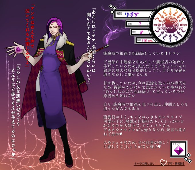 逢魔時の狼達で記録係しているオジサン(?)です!セクハラやお下品な発言多めですが割と頼りになる人なので良かったら遊んでやってください♥