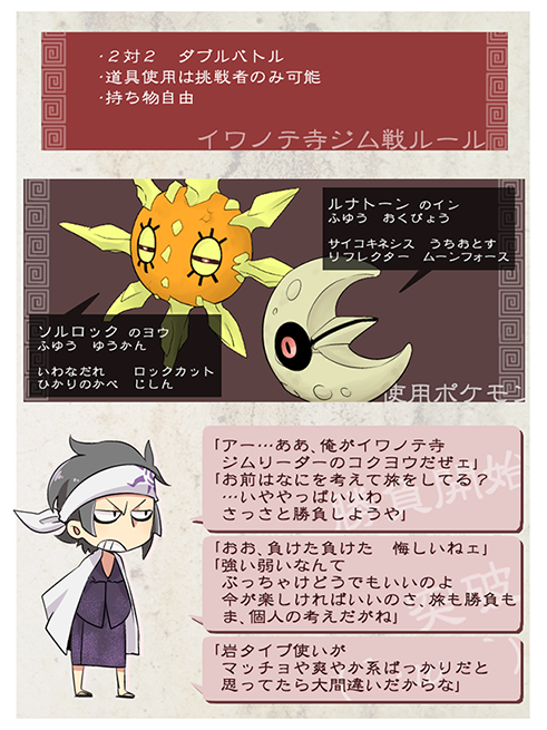 @kimitabi_TL 「生命が生まれる町イワノテのジムリーダーコクヨウ様だ!…誰がものぐさ坊主だ俺は陰陽師だって言ってんだろ!」 #君旅 #君旅キャラシ #君旅補足 #シオウジム #シオウジムリーダー #イワノテジム