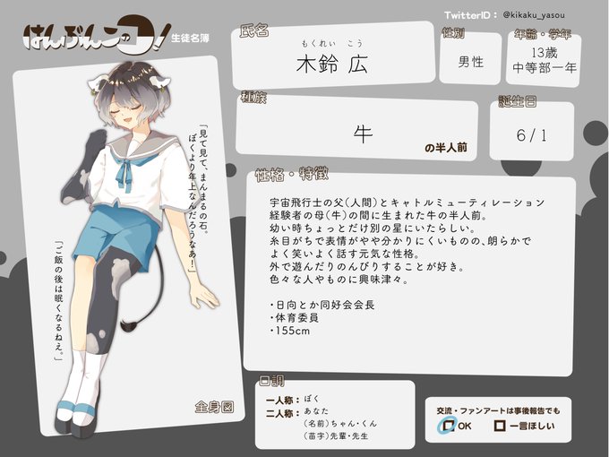 【キャラシ更新】 牛の半人前、木鈴広です。これからもよろしくお願いします…! 旧シートや他設定はリプツリーにて。 #はんぶんこのコ #はんのコCS