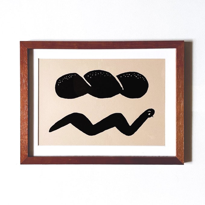 今回の展示ではフルーツを抱えている人のフルーツが盛り付けられていたり運んできたパンにヘビが近づいてきたりと会場内で作品同士がリンクするようなモチーフ選びをしています。