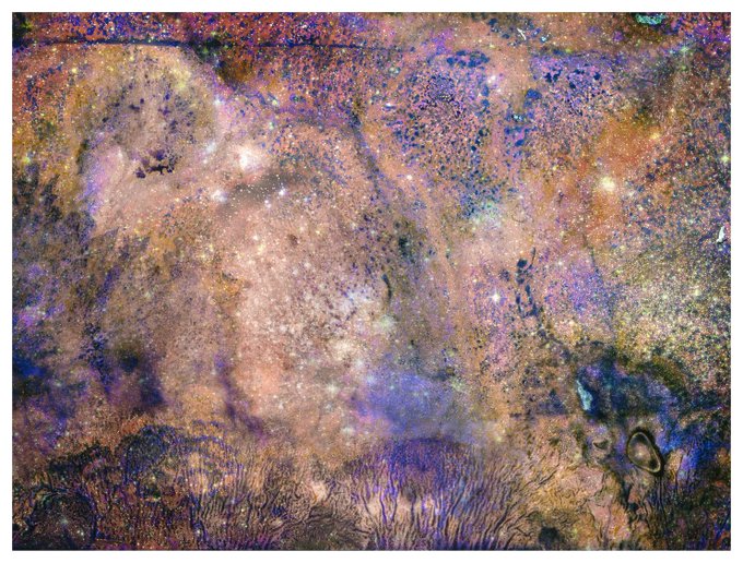 Beautiful pieces from Marcus DeSieno in “Cosmos,” a photographic #sciart project where he grew microscopic bacteria onto photographic film of space-based imagery. Lovely integration of 2 of my favorite scientific fields: